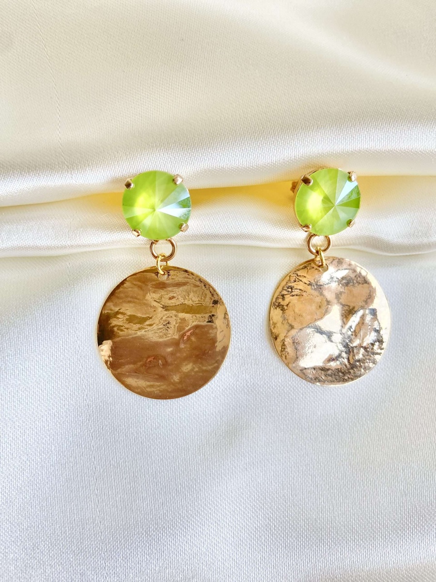Orecchini fatti a mano. Composti da perno con cristallo naturale color lime e disco martellato inferiore bagnato in oro ( diametro disco martellato inferiore 25mm ) e finiture bagnate in oro, anallergiche e nickel free