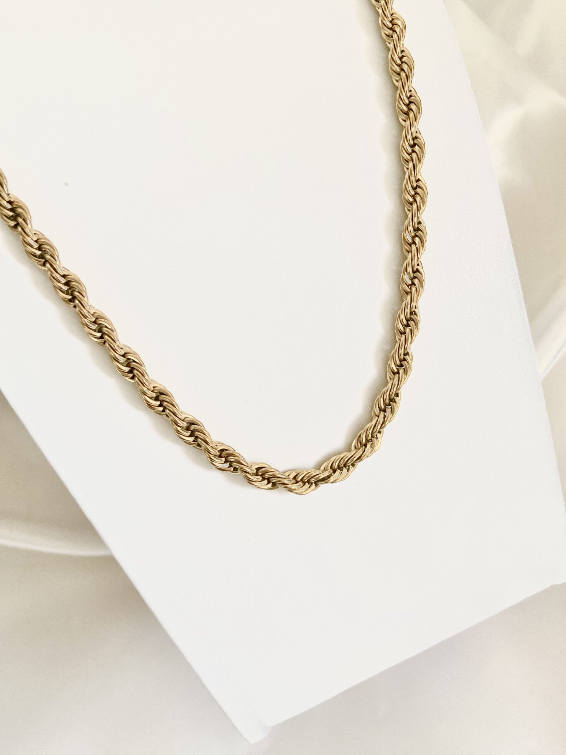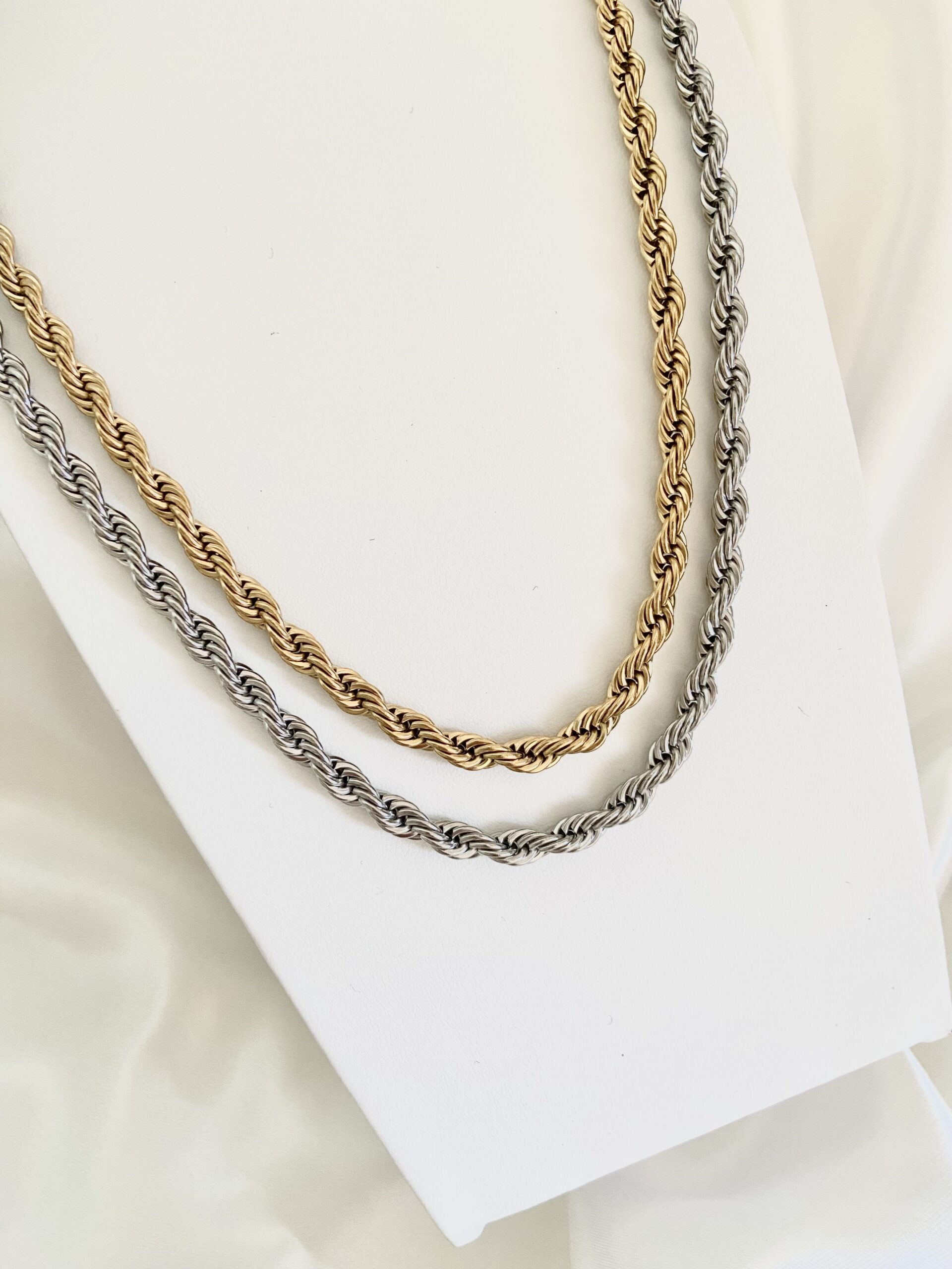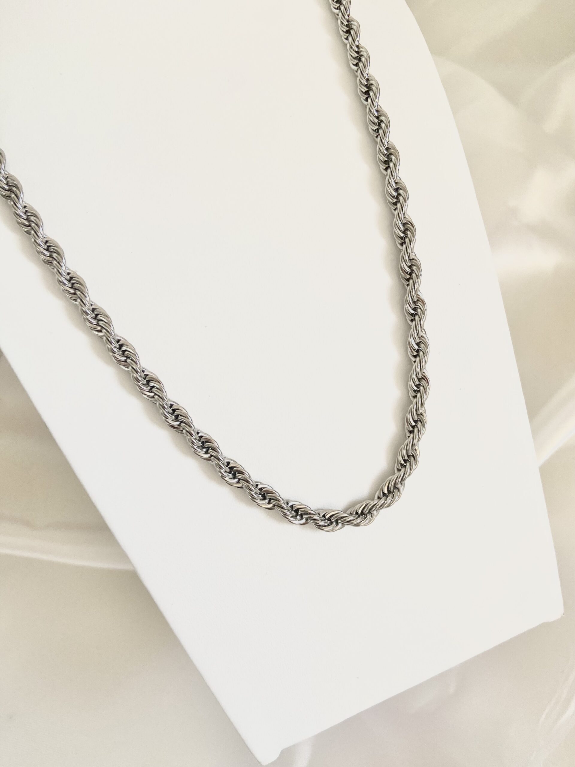 Collana realizzata maglia corda, spessore collana 5 mm, chiusura con moschettone, acciaio bagnato in oro o argento