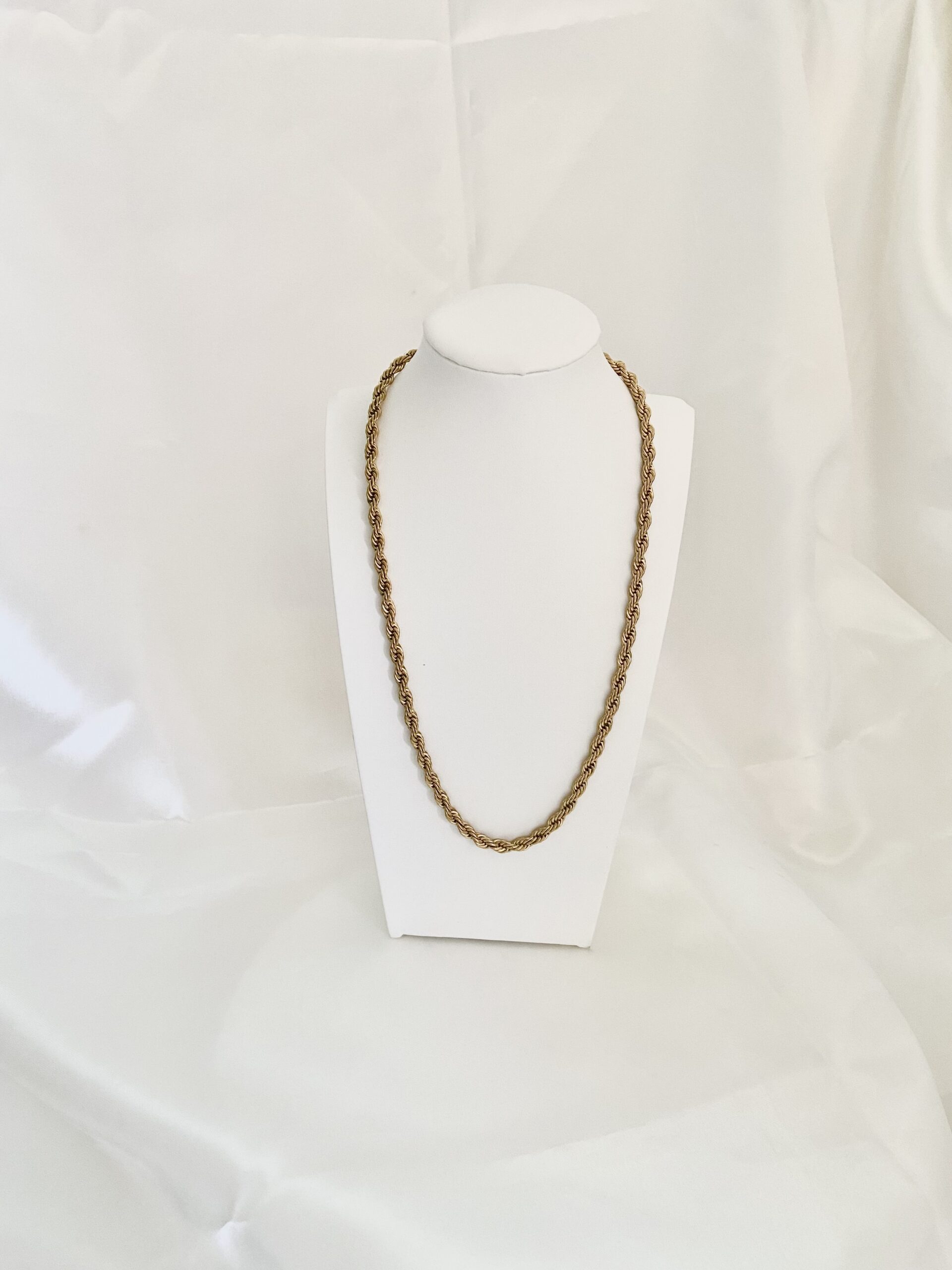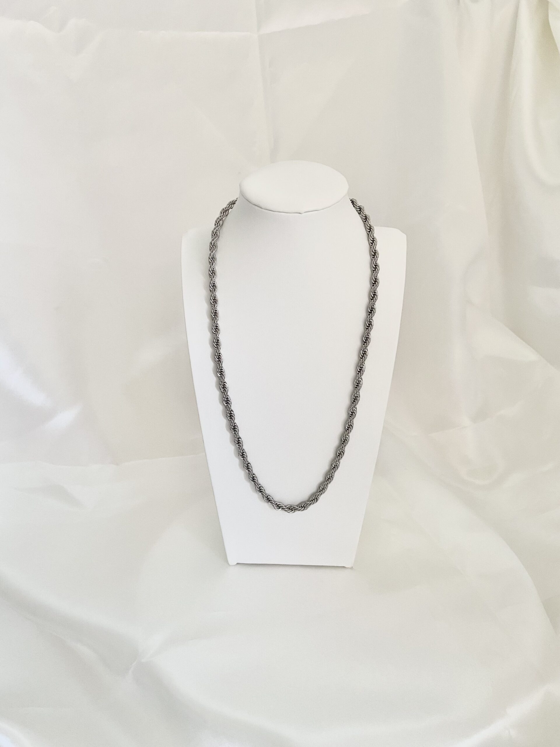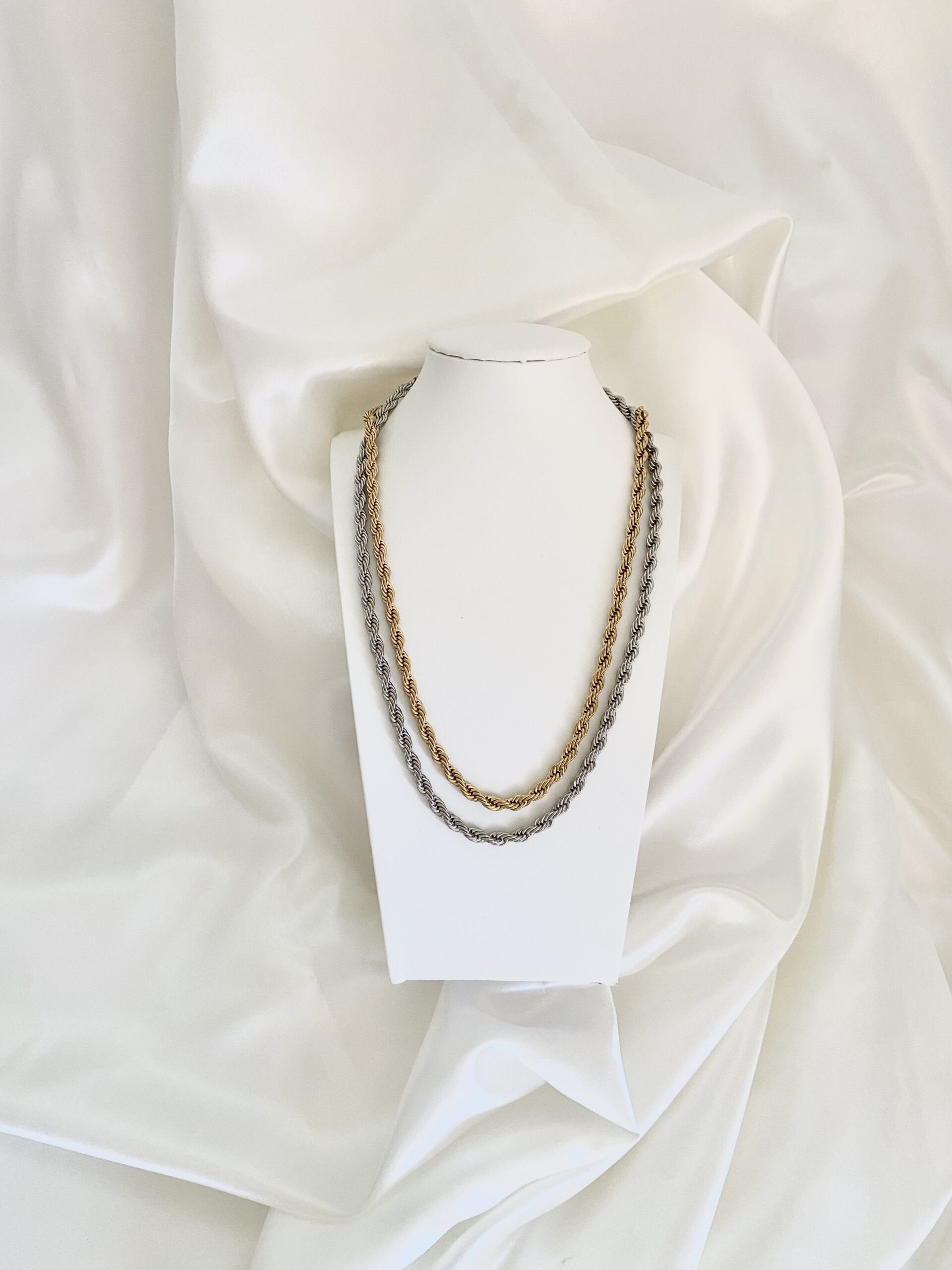 Collana realizzata maglia corda, spessore collana 5 mm, chiusura con moschettone, acciaio bagnato in oro o argento