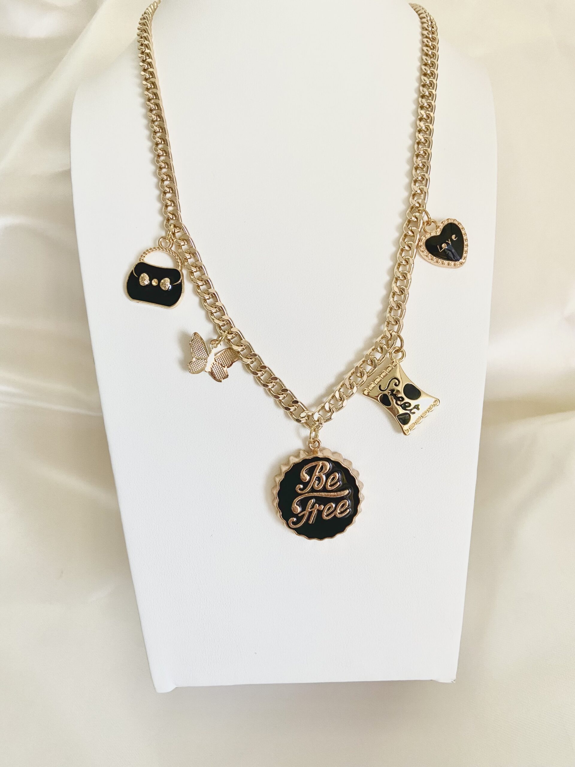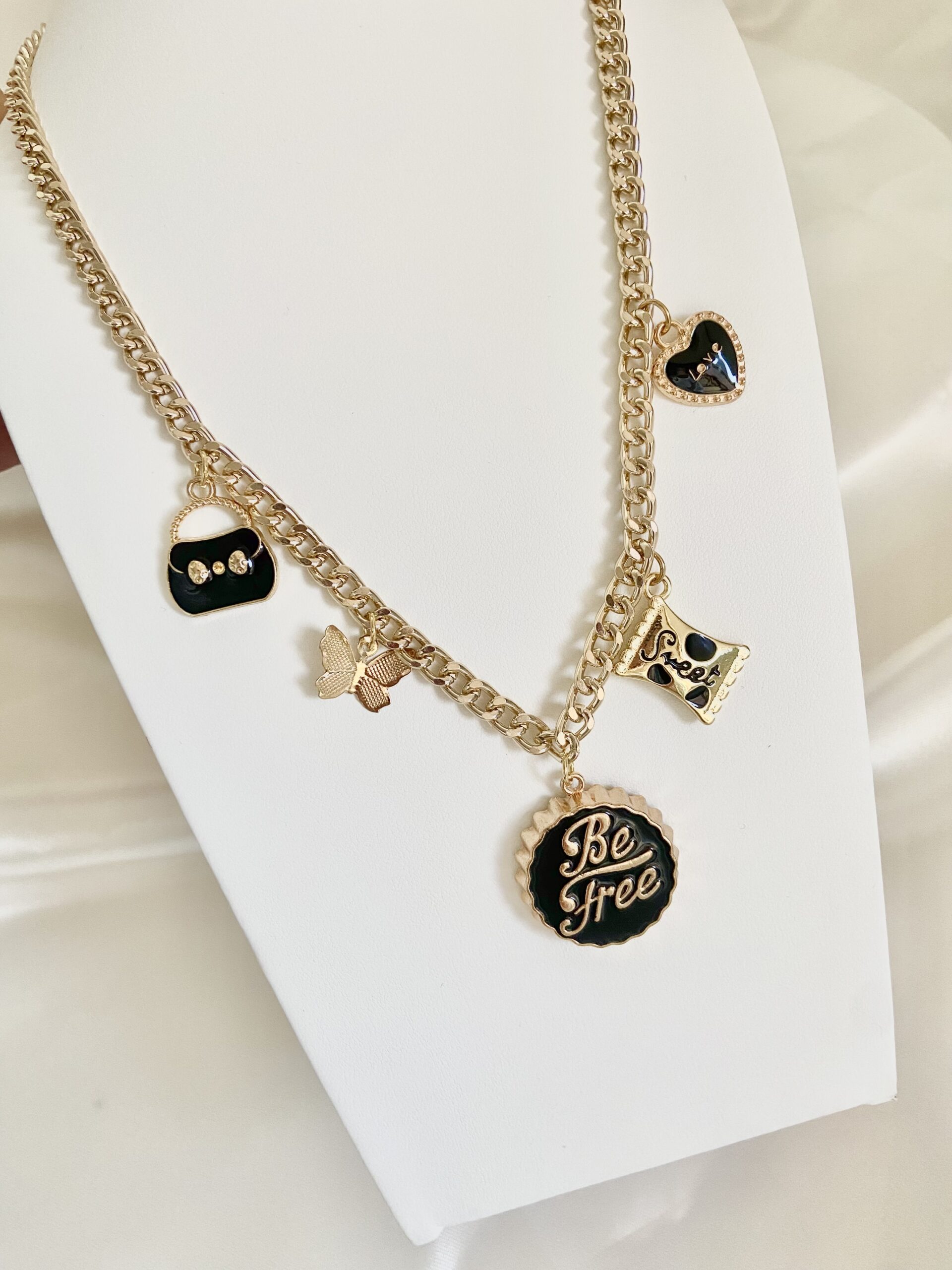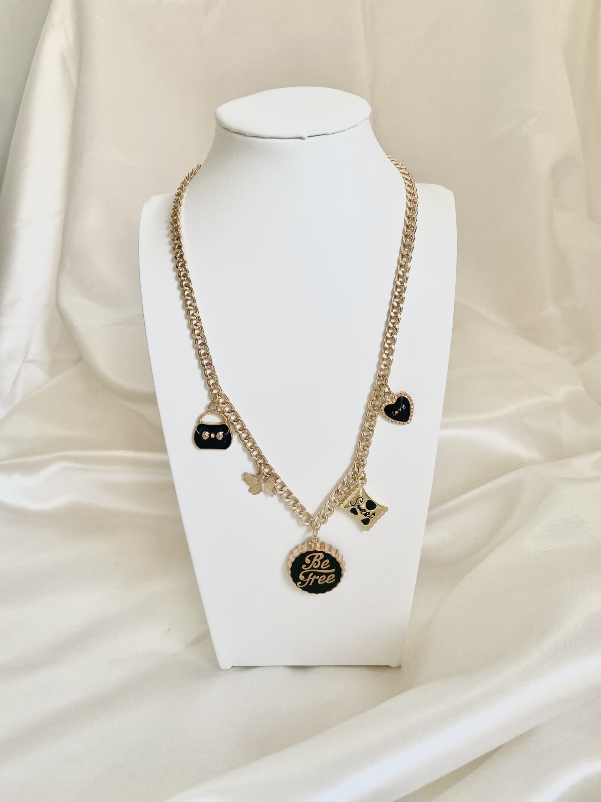 Collana in ottone bagnato in oro, ciondoli varie forme, chiusura con moschettone