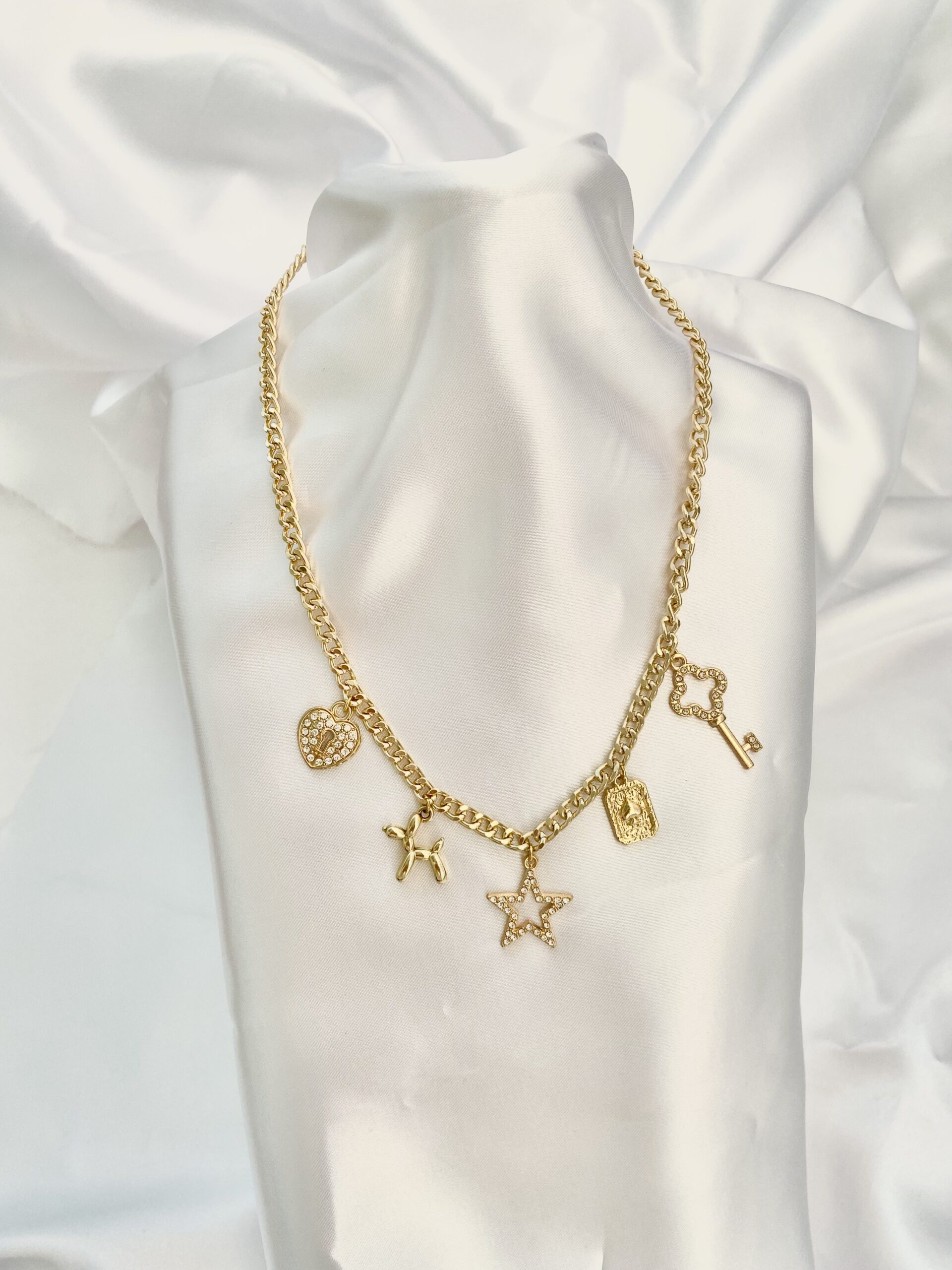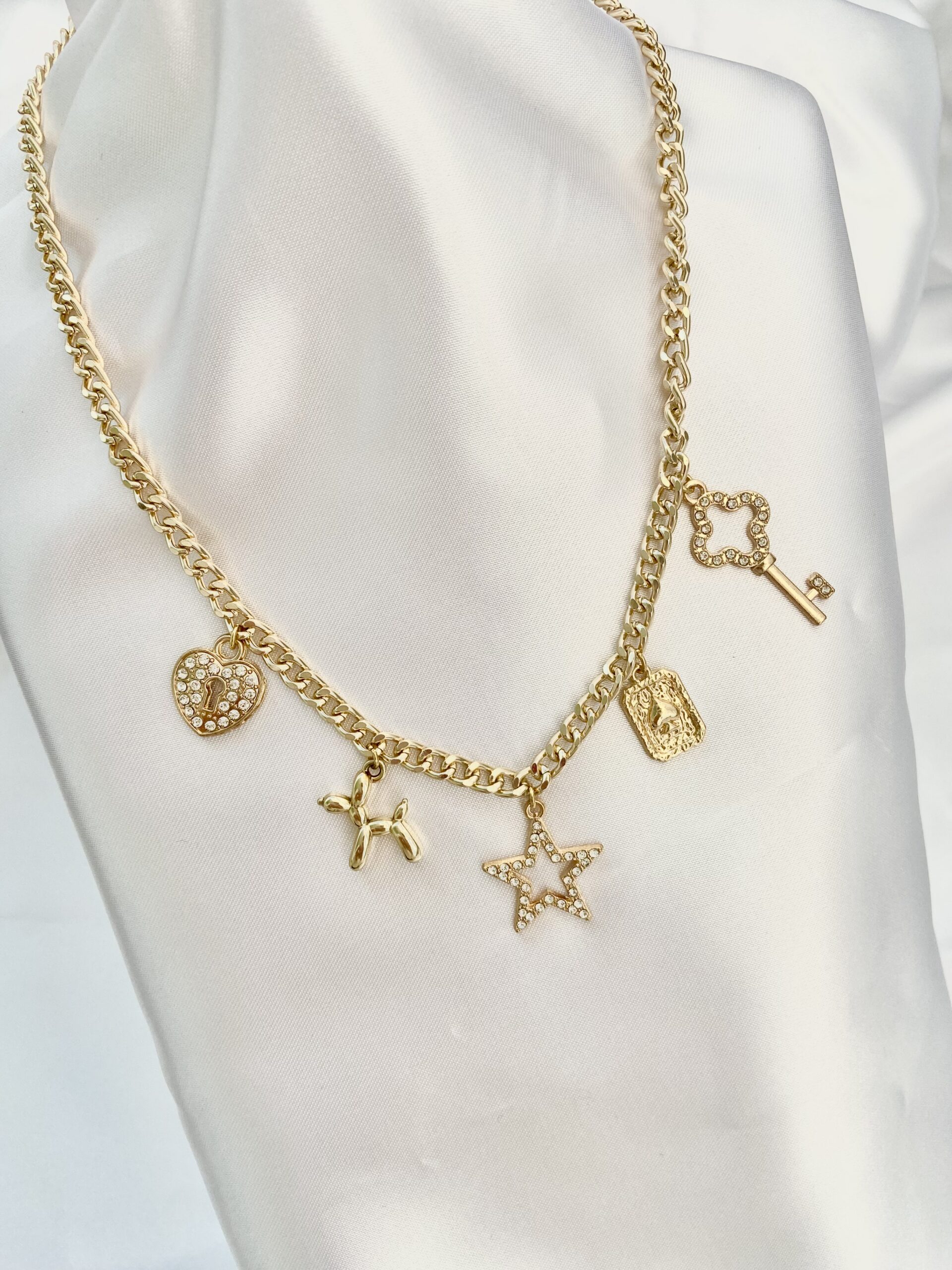 Collana realizzata a mano, maglia catena, ciondoli, finiture con bagno in oro, anallergiche e nickel free